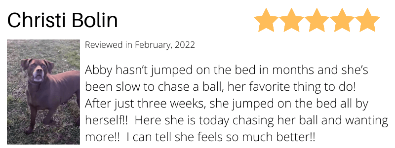 "After just three weeks, she jumped on the bed all by herself!! Here she is today chasing her ball and wanting more!! I can tell she feels so much better!!"