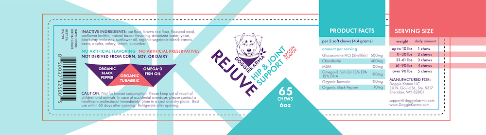 Doggie Karma ReJuve Chews are made with six active ingredients to support joint health. They're bacon-flavored, soft chews that can be served as treats or added in your dog's food daily.