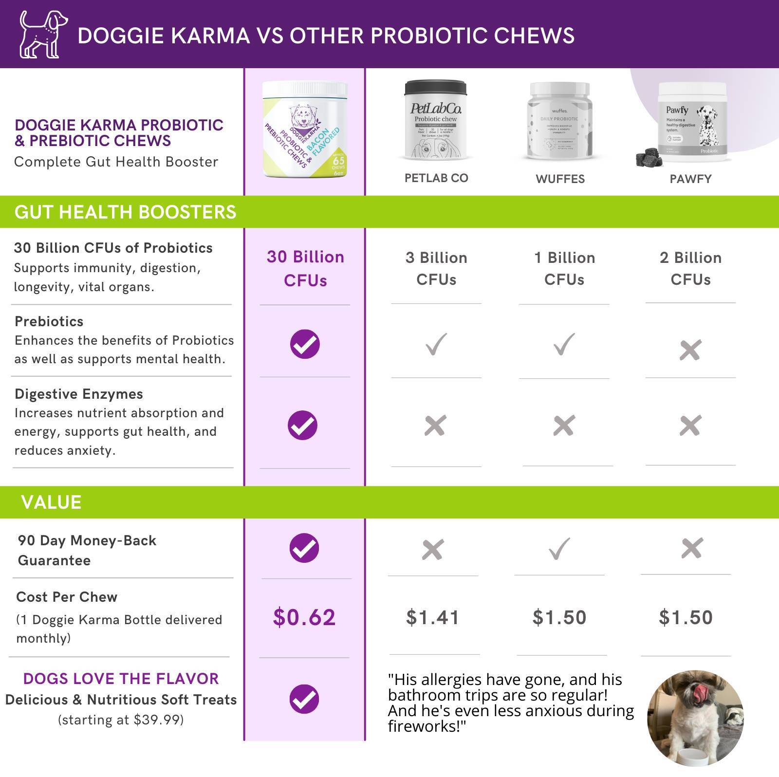 First of all, these chews contain a LOT more probiotics than most other chews, which is very important for efficacy. Also, probiotics are just one piece of the puzzle. Various studies have shown great benefits when probiotics are combined with prebiotics. And even greater benefits could be achieved when combined with other gut health boosting ingredients like postbiotics and digestive enzymes. Doggie Karma's Probiotic Chews contain all these additional gut-boosting ingredients PLUS 30 billion CFUs of 6 strains of probiotics. So why not give your dog the most comprehensive gut health and immunity health booster!