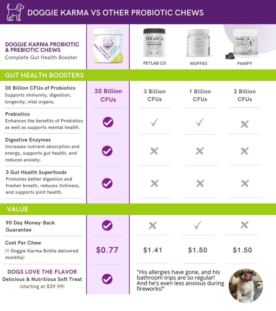 First of all, these chews contain a LOT more probiotics than most other chews, which is very important for efficacy. Also, probiotics are just one piece of the puzzle. Various studies have shown great benefits when probiotics are combined with prebiotics. And even greater benefits could be achieved when combined with other gut health boosting ingredients like postbiotics, digestive enzymes, ginger, fennel, and anti-inflammatory oil. Doggie Karma's Probiotic Chews contain all these additional gut-boosting ingredients PLUS 30 billion CFUs of 6 strains of probiotics. So why not give your dog the most comprehensive gut health and immunity health booster!